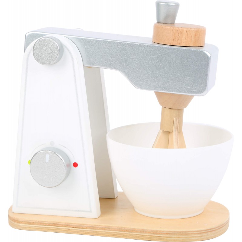 La bataille des chefs cuisiniers peut commencer! Ce beau batteur est tout ce dont les enfants rêvent. Il permet aux petits d'imiter maman en préparant un bon gâteau. Le fouet qui tourne et le plat en plastique aident les petits cuisiniers. Le batteur solide en bois mélange la pâte avec son fouet qui tourne dans le plat stable en plastique. Grâce à l'agitateur pivotant qui peut être rabattu vers le haut, on peut facilement ôter le plat. Le bouton on/off se tourne comme sur un vrai batteur. Le mixeur a une bonne tenue stable sur son socle. Qui le met en marche?