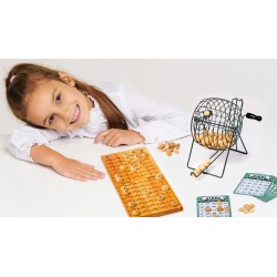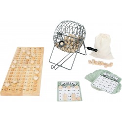 Bingo, carton plein ! Comme dans les grandes salles de loto-bingo, c´est sur une table, que se fait de tirage des nombres. Comme chez les professionnels, le mélangeur de billes en métal tire le numéro à trouver. Aux joueurs de chercher ! Les 24 cartes, les 75 billes de bois, les 150 jetons de bois et la planche de jeu en bois solide garantissent une belle partie de jeu. A votre manivelle, prêts, partez !