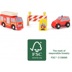 Au feu! Avec ce kit de pompiers de 4 pièces en bois certifié FSC® 100% de notre univers de jeu small foot world, tu es parfaitement équipé! Conduis en tête avec le véhicule de direction, coordonne l´intervention et installe un barrage. Ensuite ouvre l´eau! La voiture de pompiers avec échelle mobile arrive et éteint le feu en un temps record. Deux véhicules avec roues à roulement aisé, un barrage de route et un feu font partie de ce kit qui est un complément parfait pour la caserne de pompiers et les autre produits small foot world!