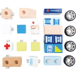 Le docteur va vite vers le lieu d´intervention. Les blocs de construction robustes en bois se laissent également empiler afin de créer un hôpital.