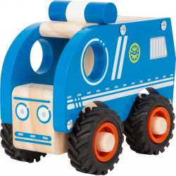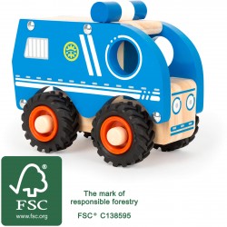 Haut les mains! Ce camion de police en bois certifié FSC® 100% ne laissera filer aucun voleur! Grâce aux roues en caoutchouc, le jouet en bois massif fait face à tous les obstacles. Les policiers pourchassent les bandits, les enferment dans le coffre et direction la prison. Un joli complément pour la flotte de véhicules des enfants !