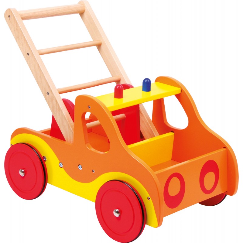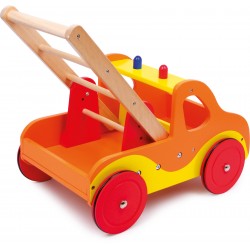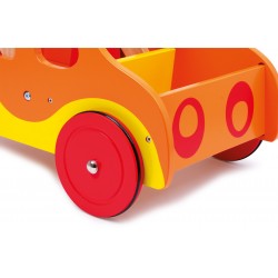 Solidement conçu et verni de couleurs lumineuses, cette voiture en bois assiste et aide les tout-petits à faire leurs premiers pas ! Les roues sur axe métallique sont munies d‘anneaux de caoutchouc pour un roulement silencieux et la voiture offre de la place pour quelques jouets.